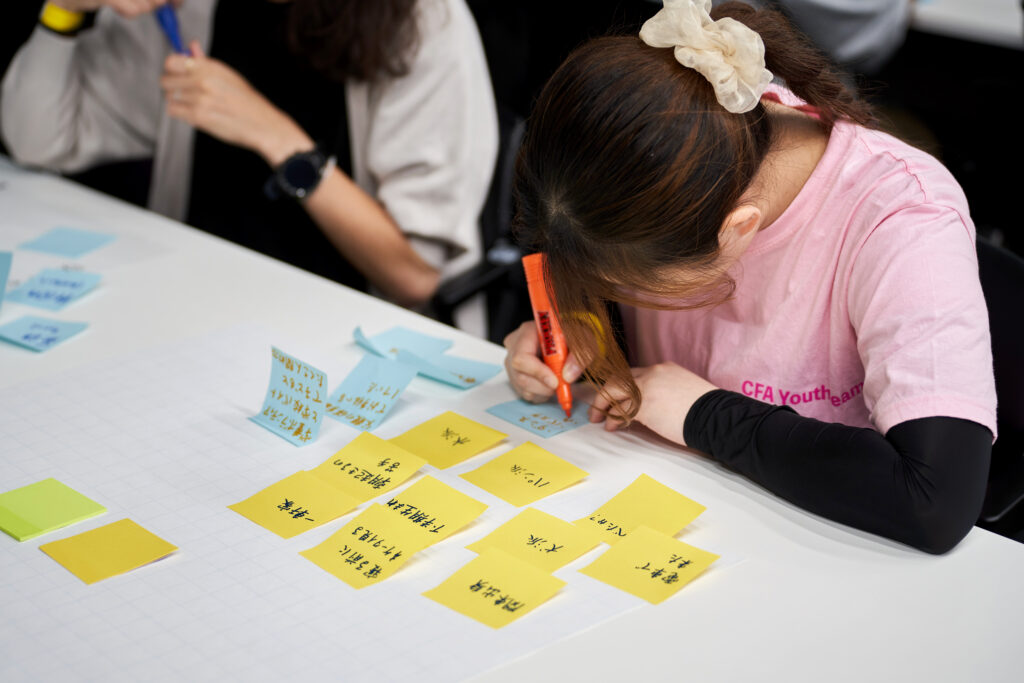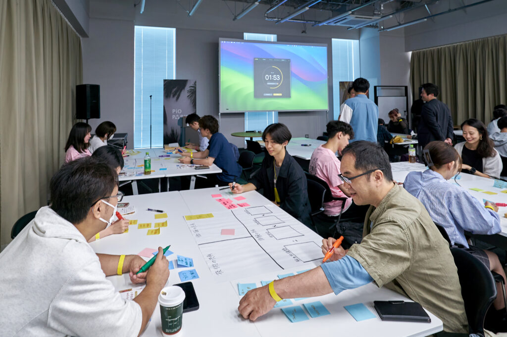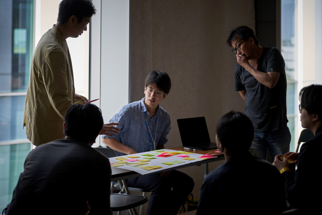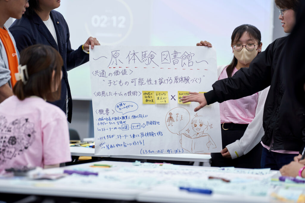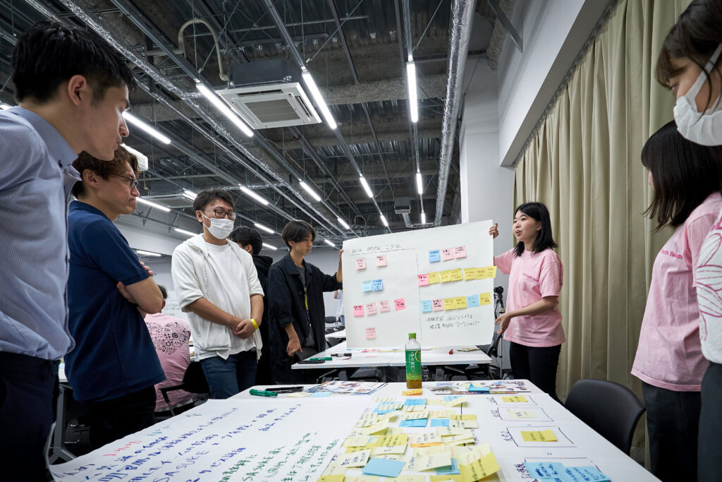 用意された模造紙のフォーマットにアイデアなどを付箋で書き出しつつ、グループごとに教育をよりよくするサービスを考え、企画として練り上げます。子どもにも余裕が必要だと「勉強のフリをした合宿」を提案したり、子どもの可能性を広げていくための原体験を提供したいと「原体験図書館」という企画を考えるなど、どれもわずか1時間ほどで考えたとは思えないほど、楽しく魅力的な内容でした。