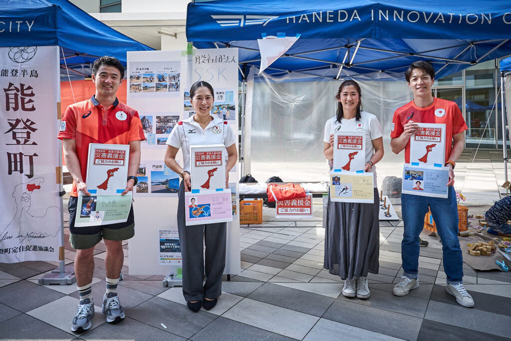 石川県出身のオリンピアンらによる能登半島地震の募金活動が行なわれた。写真左から、トランポリン競技の岸大貴選手(小松市)、飛込競技の中川真依選手(現在は引退/小松市)、スケルトン競技の小口貴子選手(輪島市)、卓球競技の松平健太選手(七尾市)。一緒に写真を撮ってもらったりと、ちょっとした人だかりに。