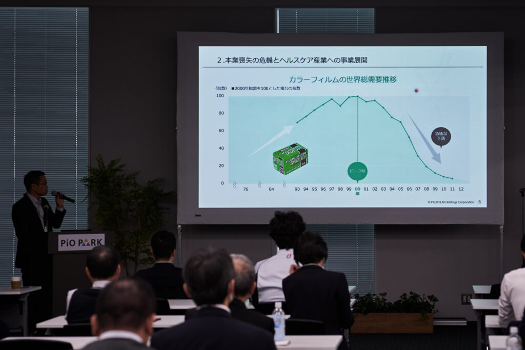 基調講演を行った富士フイルムの松田氏は、写真フィルム事業からヘルスケア分野への事業転換をテーマに講演。同社は2000年をピークに写真フィルム需要が急減する中、同社が持つ既存の技術を活かしたヘルスケア分野での事業拡大を紹介。医療機器市場への新規参入を検討される来場者に向けて、自社技術と医療機器市場の分析、そして医療現場のニーズに沿った開発の重要性を提言しました。