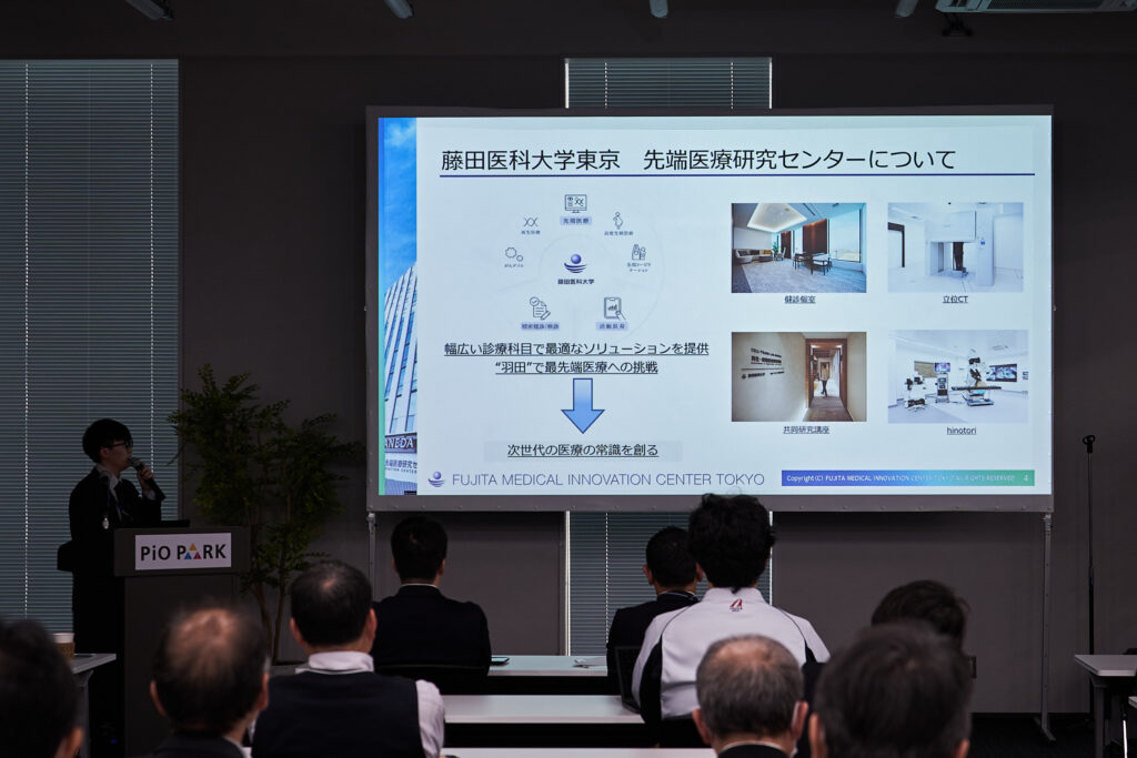 基調講演を担当した藤田医科大学の月村氏から、同大学での医工連携の取り組みについて紹介。同大学は愛知県を拠点に4つの教育病院を持ち、2023年10月にHICity内に「藤田医科大学東京 羽田クリニック」を併設した次世代医療・研究の拠点「藤田医科大学東京 先端医療研究センター」を開設。同大学はこれまでトヨタ自動車との共同研究によるリハビリ支援ロボットの開発など、50社以上の企業との共同研究を実施しています。今後、藤田医科大学東京 先端医療研究センターでの実証実験の受け入れ体制の整備を進めていくことを伝えました。