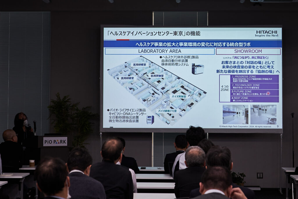 ヘルスケア事業に関連した企業3社によるピッチタイムの1社目は株式会社日立ハイテク。同社の堀田氏より説明がありました。体外診断(血液検査)・治療(放射線治療、再生医療)分野の製品開発、設計、製造、販売を行う、ヘルスケア事業の説明がありました。HICity内にある同社のヘルスケアイノベーションセンター東京の運営を通じたお客様との対話・協創を強化していくとのこと。