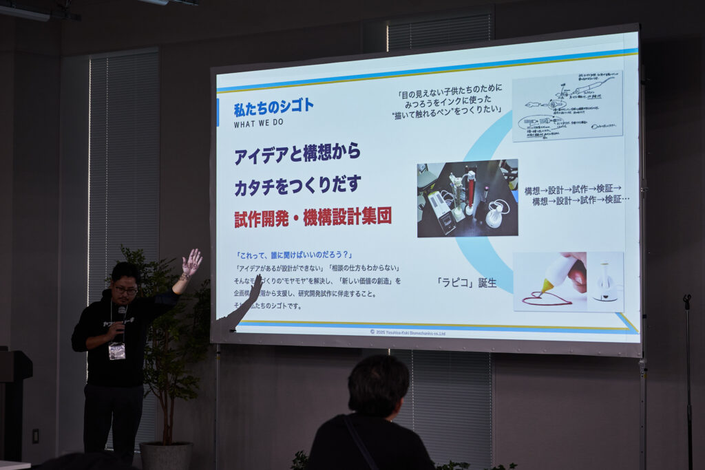 ピッチタイム3社目となる地元大田区を拠点とする有限会社安久工機の田中氏からは、町工場としての医療機器開発支援の取り組みを紹介しました。同社は人工心臓開発のルーツを持ち、ヘルスケア事業を含めた約1万5千件の試作開発プロジェクト実績を持っています。2024年5月には、医療機器スタートアップとの共同開発拠点を開発予定。