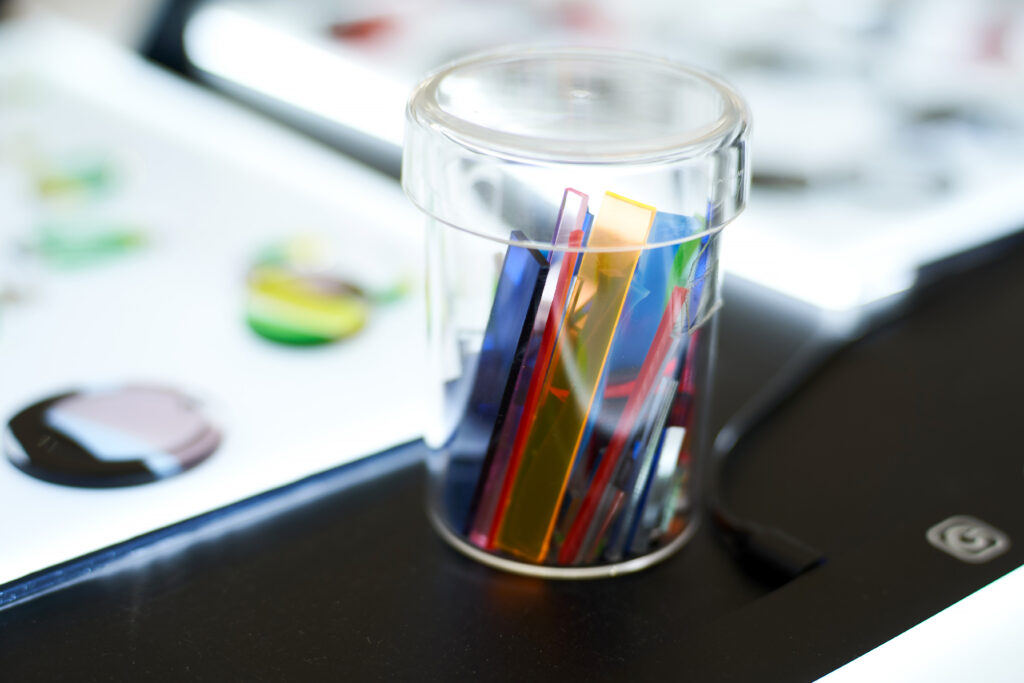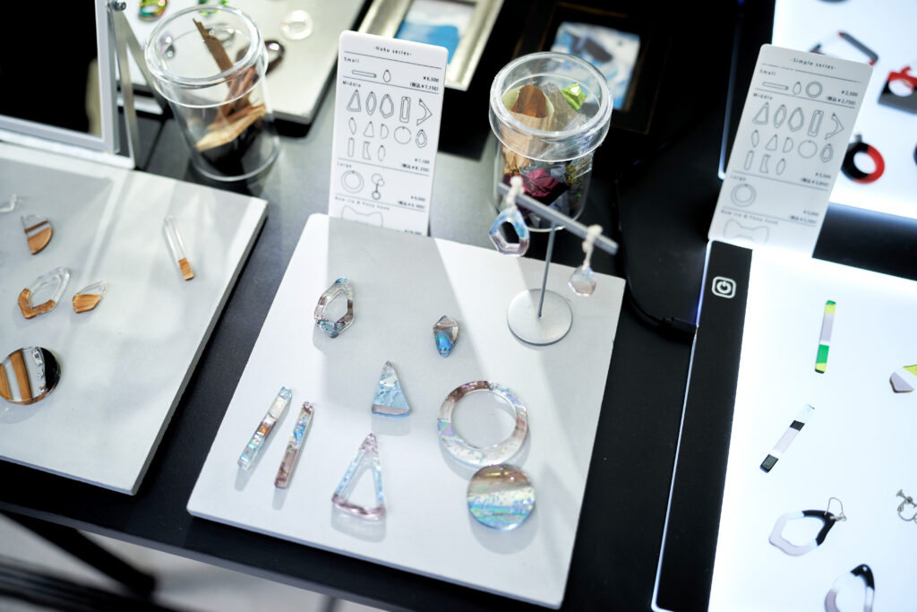 「アクリルがとても好きで、加工も含めすべて自社で行っています。アクリルをメインとして、鏡や木、紙や繊維、化粧品からコーヒー豆、海洋プラスチックなどいろいろな廃材をアップサイクルしてアクセサリーとして新たな命を吹き込み、店舗やポップアップストア出店、オンラインストアにて販売を行っています。アクリルは発色が良いので色の組み合わせには気を配っていますが、着色は一切せず、クリアなアクリルと他の素材を組み合わせることでデザイン性を高め、カラフルなものやシックなものなどさまざまなパターンを作っています。」(代表:井村文紀さん)