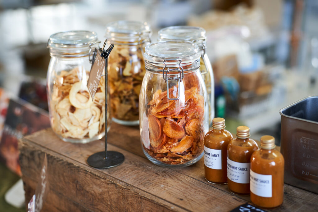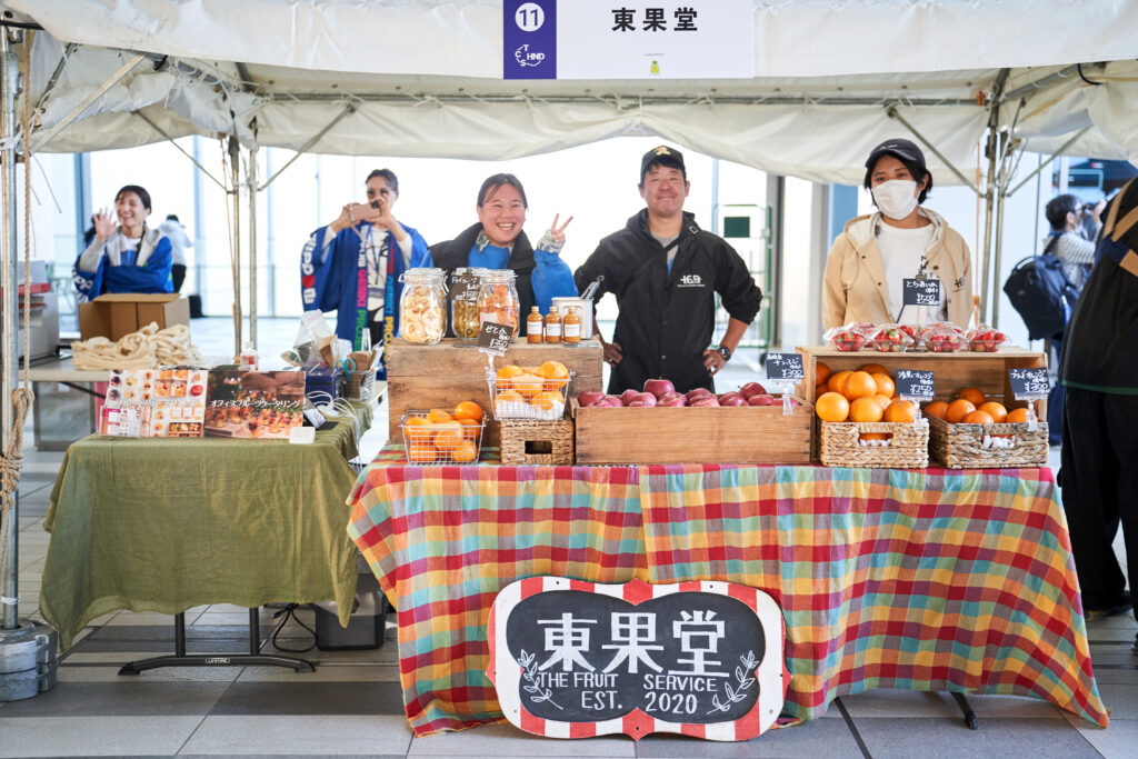 フルーツ専門のケータリングサービスを行う東果堂は、企業のイベントやパーティ、撮影現場や舞台楽屋などへのフルーツのケータリングをはじめ、フルーツのオンライン販売やフルーツを使った空間ディスプレイのプロデュースを行うお店です。マルシェでは代表の岩槻正康さん(中央)とスタッフの方々が色鮮やかでみずみずしいフルーツの販売を行っていました。