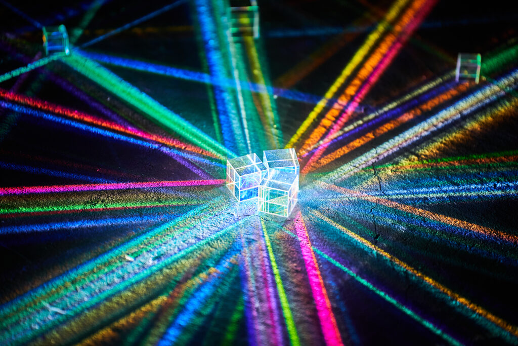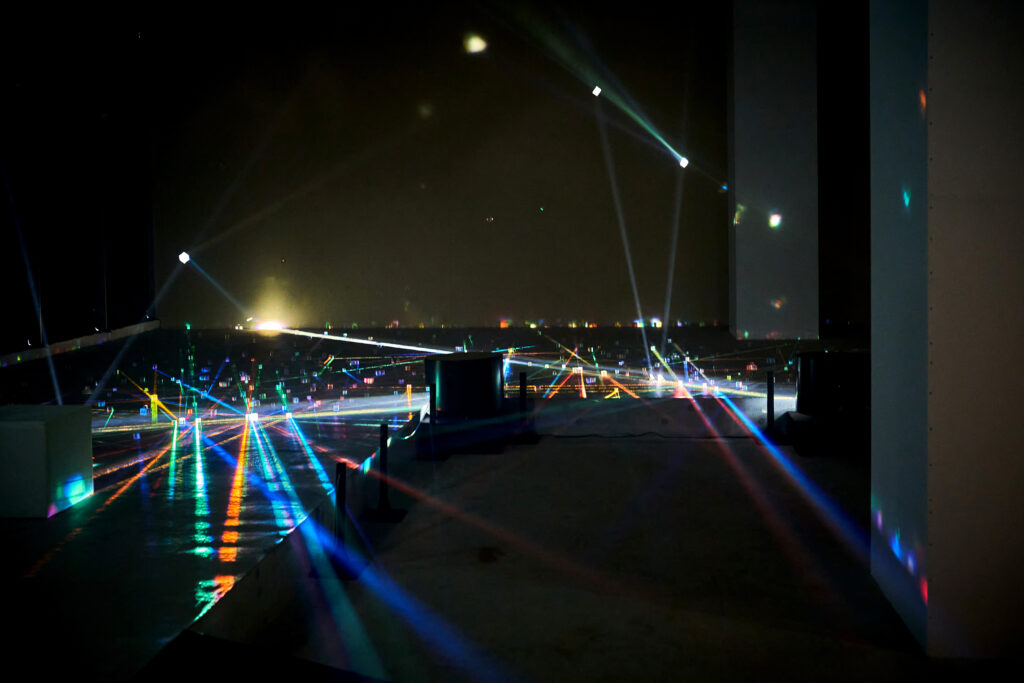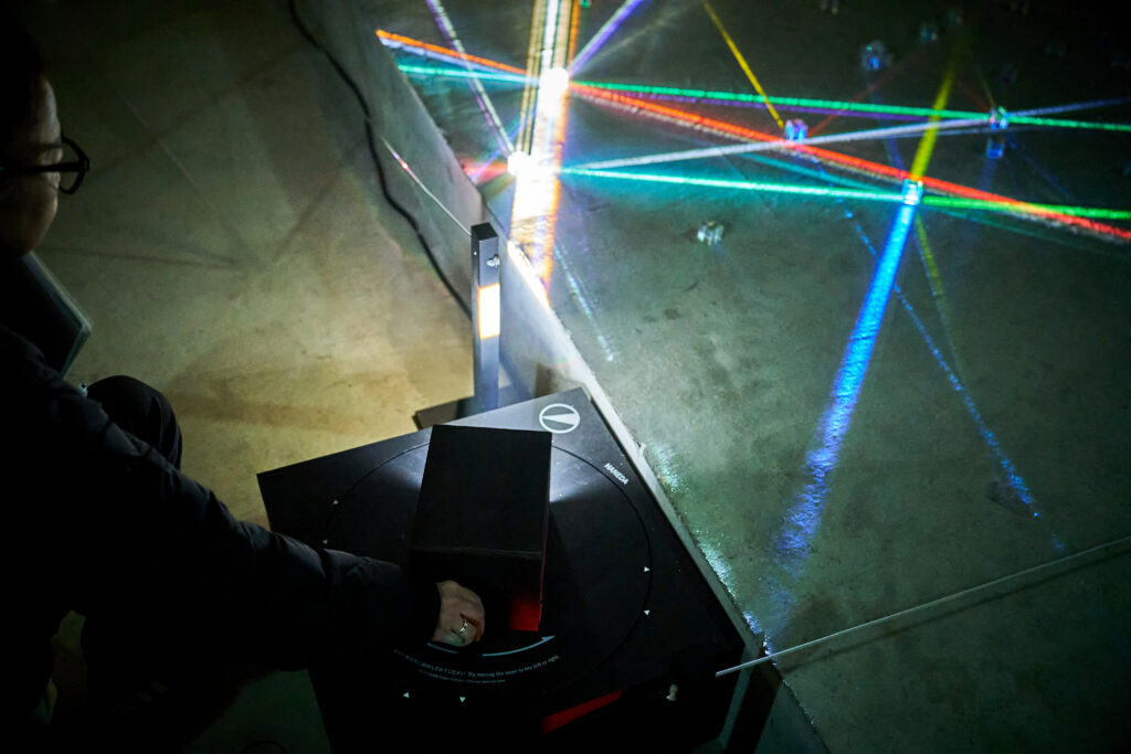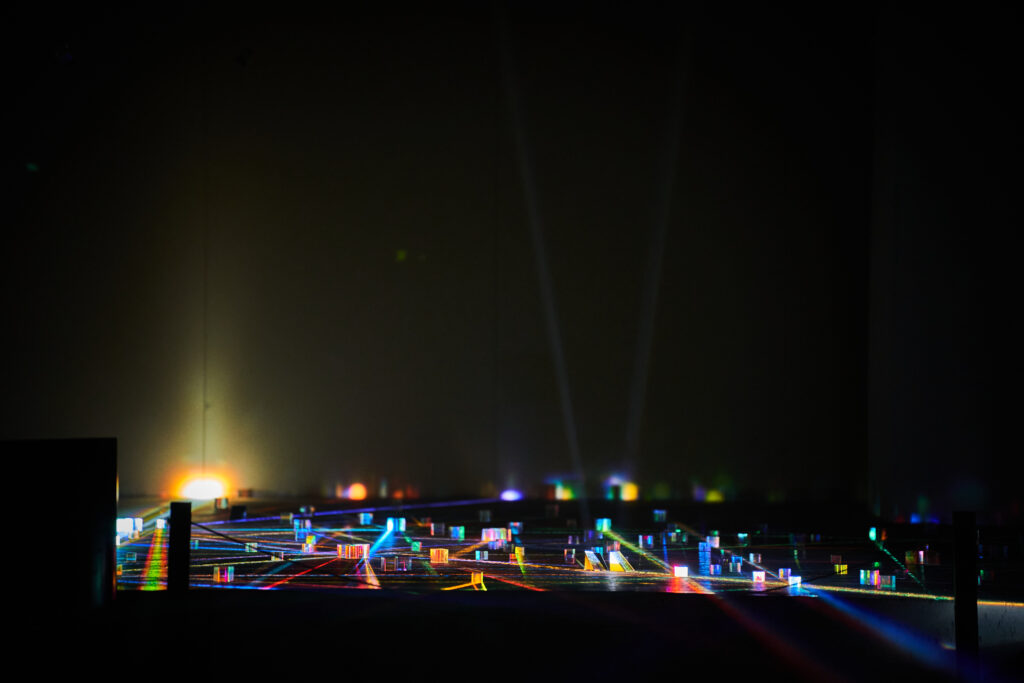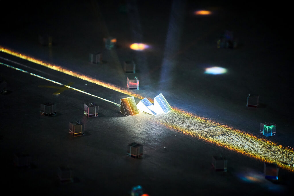 「これまで、『Prism at SENSE ISLAND -感覚の島- 暗闇の美術島』と題して、横須賀・猿島の海岸での展示を行ったり、眠らない街、渋谷の夜景を色鮮やかな光の連鎖によって表現するなど、Prismをテーマとした展示を行ってきましたが、HICityの展示では、その文脈を変え、羽田空港の航路をイメージした作品にするために、光源をゆっくり動かす1灯と、スピード感のある1灯、展示を見る人が手動で光源を動かせる1灯を使い、行き交う飛行機の軌跡や、離着陸の飛行機の動きを表現しました。図面で羽田空港の位置を決め、そこからは光の筋上にプリズムを置いていきながら、全体のイメージを作っていきました。平面だけでなく、細いテグスを使ってプリズムを吊ることで光を空間全体で見ることができます」(株式会社博展 高橋 匠さん)