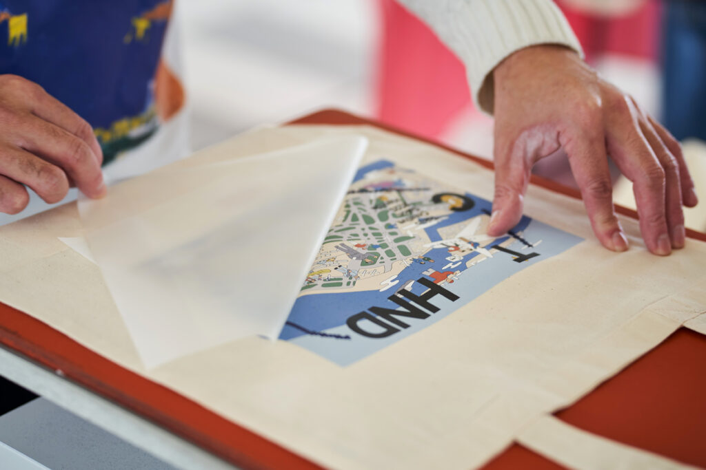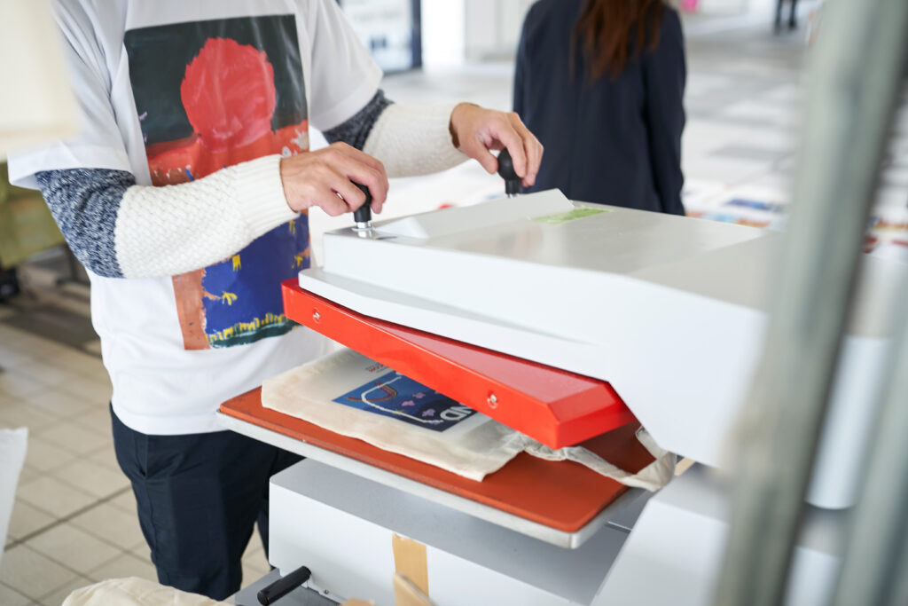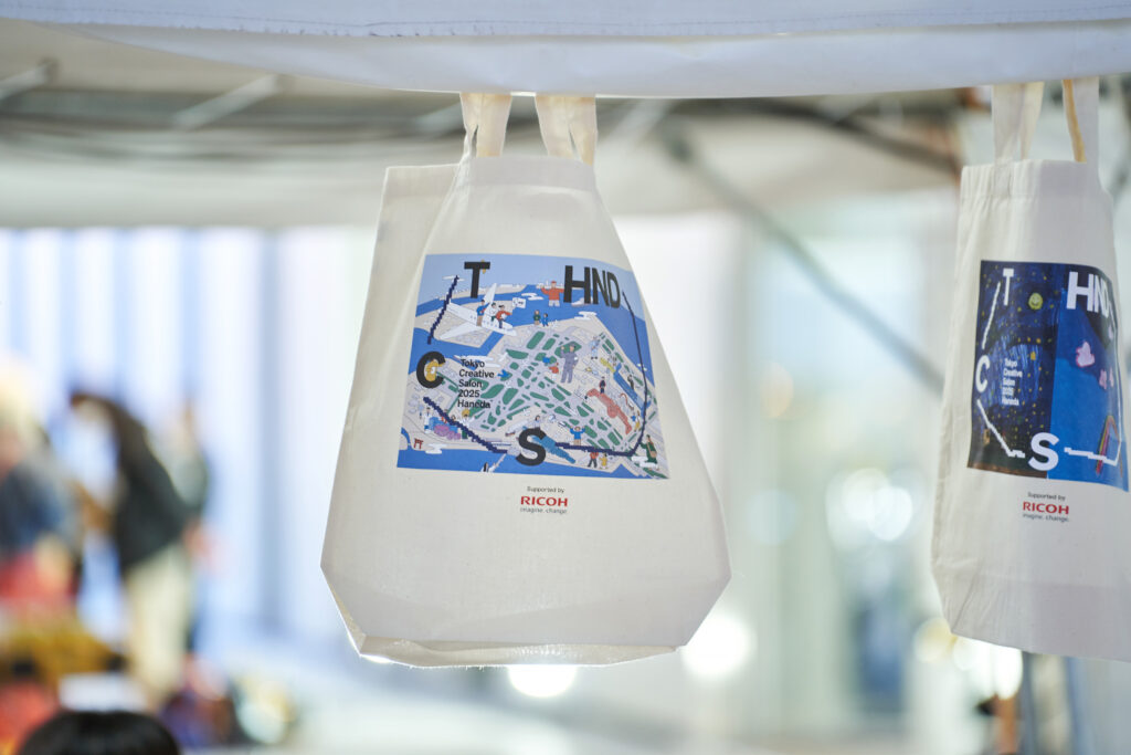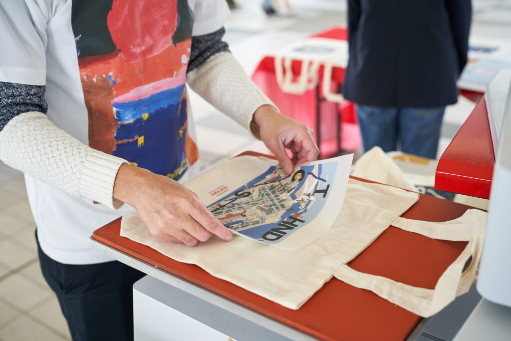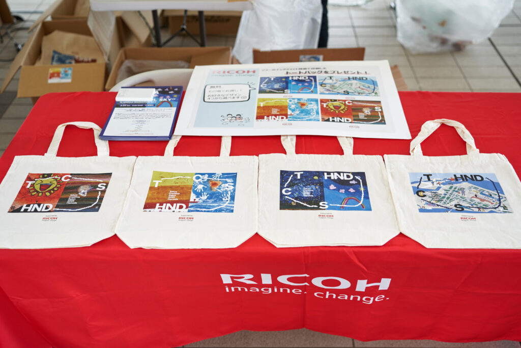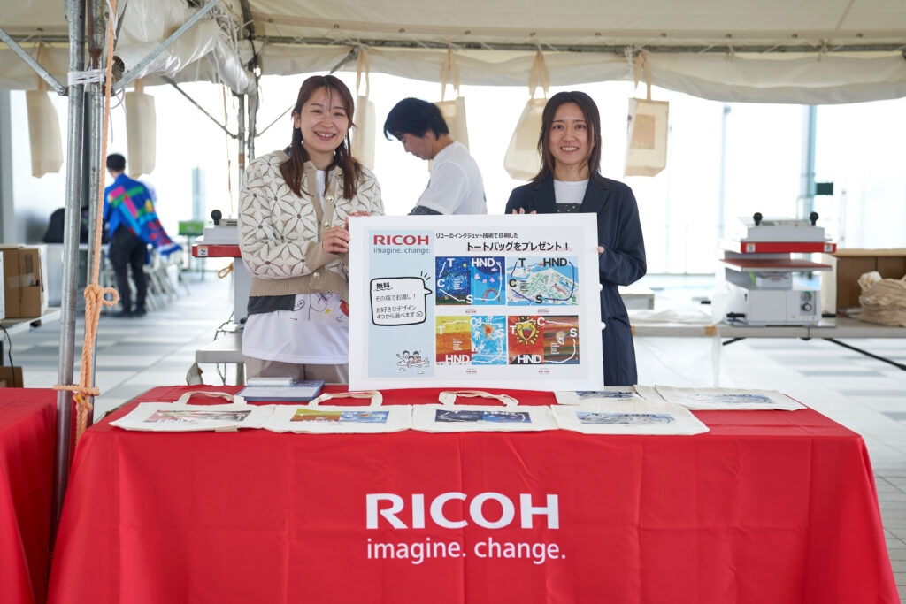 今回のTCSではリコーのブース出展もありました。DTFプリンターで作成したトートバックをHICityにてお客さまにプレゼント! 4種類の絵柄から好きなものをチョイスし、熱転写ですぐにプリント。最終仕上げの工程である布からフィルムを剥がす作業は参加者が自ら行い、バッグを完成させる、楽しい企画になっていました。