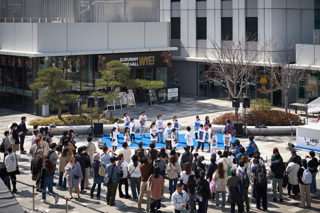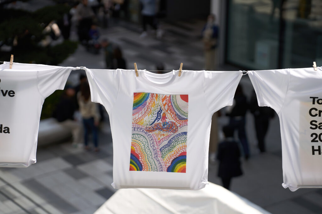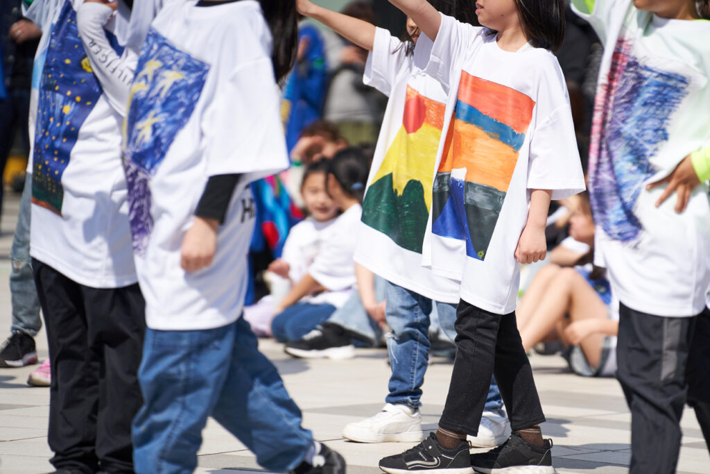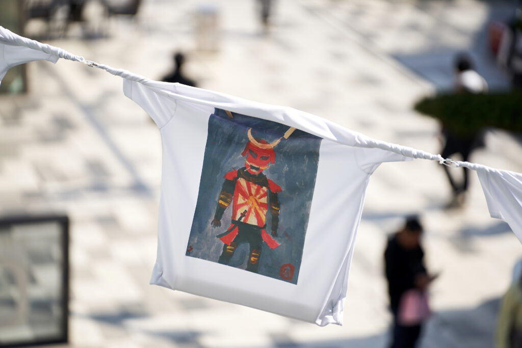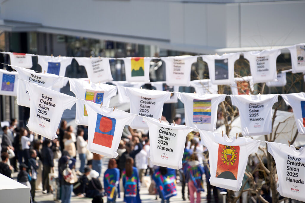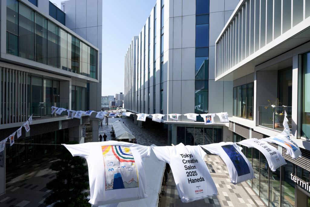「羽田小学校は、羽田空港から約900mの場所にあり、2024年のTCSでは全校生徒が折り紙で飛行機を折って、お神輿とともに、第2ターミナル国際線エリアにて飾るというインスタレーションを行いました。今年は何をしようかと考えたとき、この大田区にあるHICityに、もっと地域の人たちに来て欲しいと思い、大田区の企業と一緒に何かやりたいなと考えました。リコーさんは大田区の企業で、長いあいだ山本寛斎のショーのサポートをしてくださっていて、そのご縁で今回のDTFによるTシャツのインスタレーションが実現しました。イラストレーターの竹井千佳さん、ファッションディレクターの菅井葉月さんと共に、羽田小学校で「十人十色の空」を描くというテーマを掲げ、ワークショップを全部で8コマも行ったんですよ。」