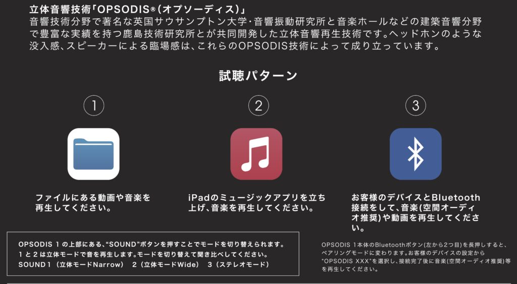立体音響技術「OPSODIS®(オプソーディス)」は、音響技術分野で著名な英国サウサンプトン大学・音響振動研究所と音楽ホールなどの建築音響分野で豊富な実績を持つ鹿島技術研究所が共同開発した立体音響再生技術で、ヘッドホンを使わずとも大きな没入感が得られます。このスピーカー「OPSODIS 1」による臨場感は、このOPSODIS技術によって成り立っているんです。