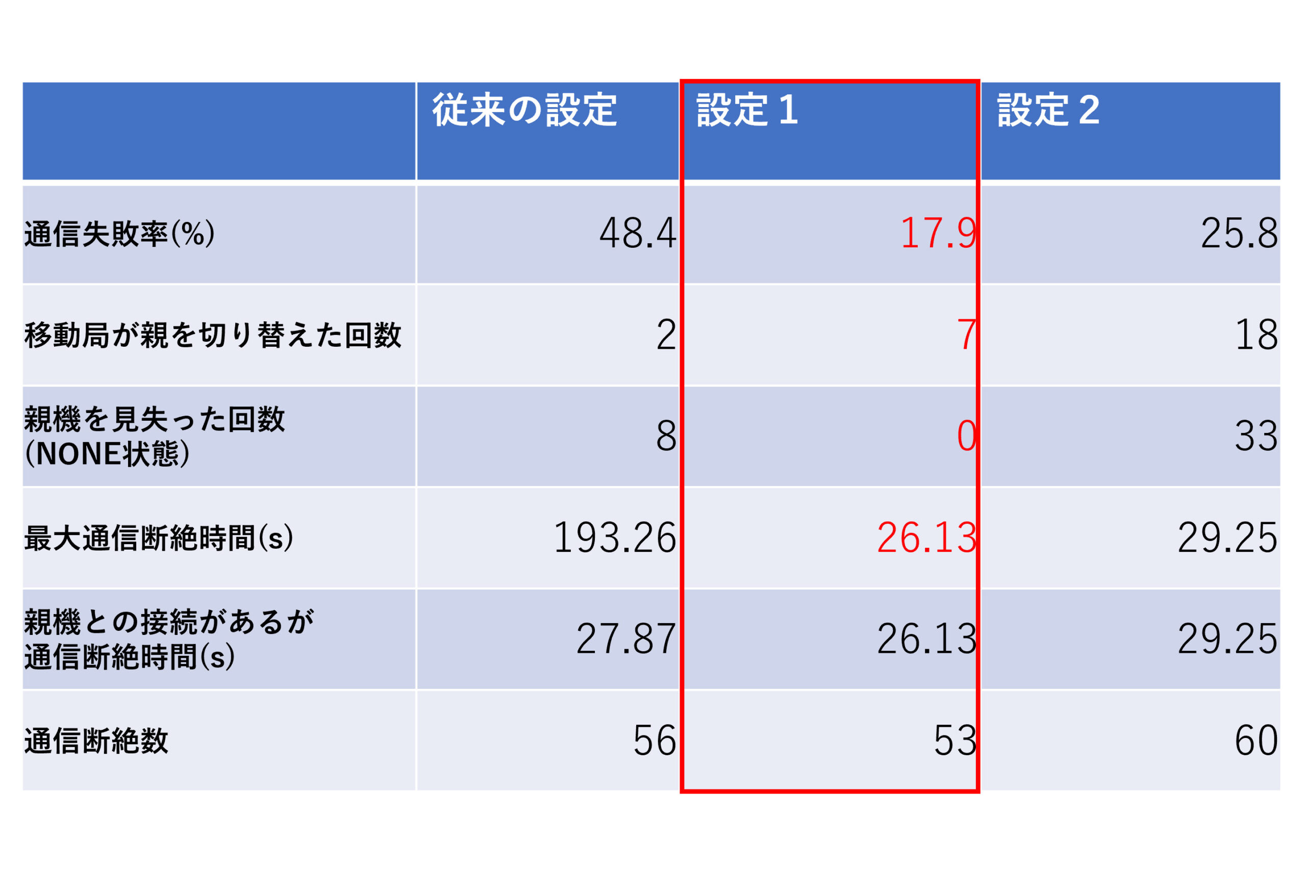 - 成果:今回の実証実験では、電波の到達距離が最長1kmと長く、かつ複数の中継器間で網目状にネットワークを構築できる「Wi-SUN FAN」を4GやWi-Fiの補助として用いました。さらにWi-SUNの設置場所の最適化や設定の更新を行い、その結果、ロボットが広範なHICityにおいて“電波が途切れることで生じるコントロール不能時間”を大幅に短縮することに成功しました。