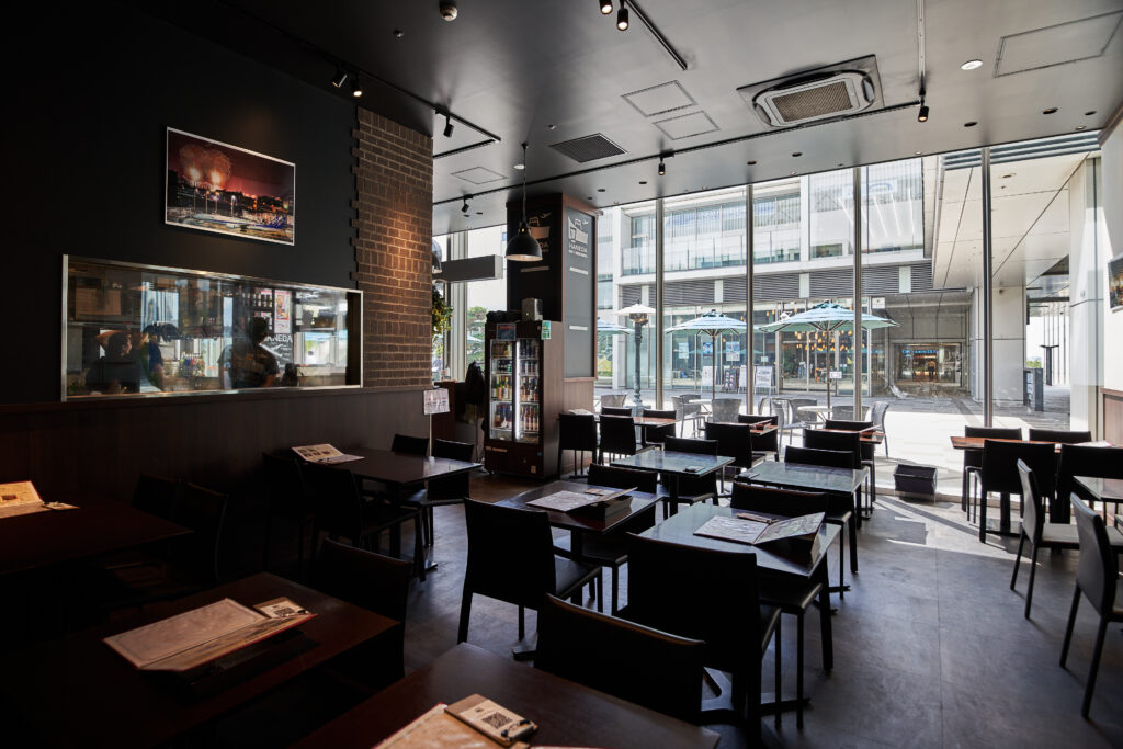 テラス席のほか、全面ガラス張りの広々した店内には、テーブル席とカウンター席を用意。グループでも一人でも入りやすく、カウンター席の一部からは醸造設備を眺めることもできます。ランチタイムはHICityで働く人々が、ディナータイムはZepp Haneda(TOKYO)にライブを観に来た人や仕事終わりの人、ホテルの宿泊客や羽田空港のトランジットの合間に立ち寄る人など、さまざまな人が訪れます。