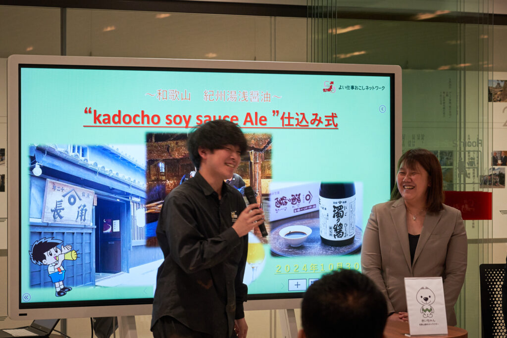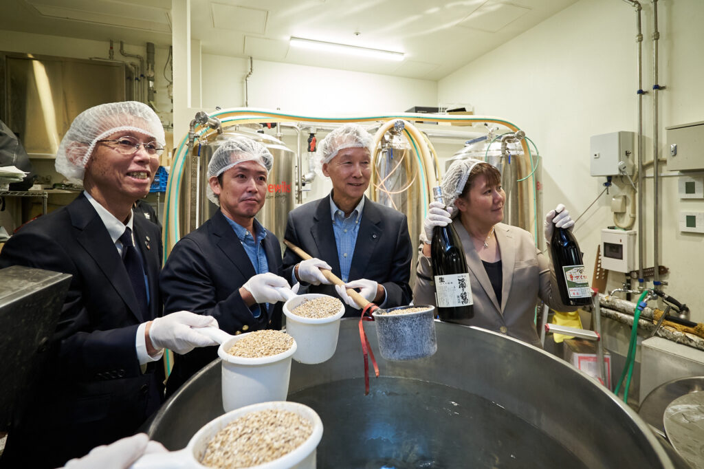 実は取材当日も、新たな地域連携ビールの仕込み式がありました。今回コラボレーションするのは、醤油発祥の地である和歌山県湯浅町の醤油。和歌山県の岸本周平知事(当時)や醤油を提供する株式会社角長の営業部長らが出席し、タンクの中にホップを投入しました。醤油もビールも、同じ発酵という過程を経て生まれるものではありますが、いったいどのようなマリアージュを起こすのか、想像もつきません。
