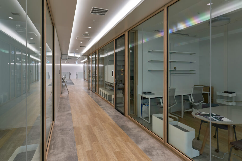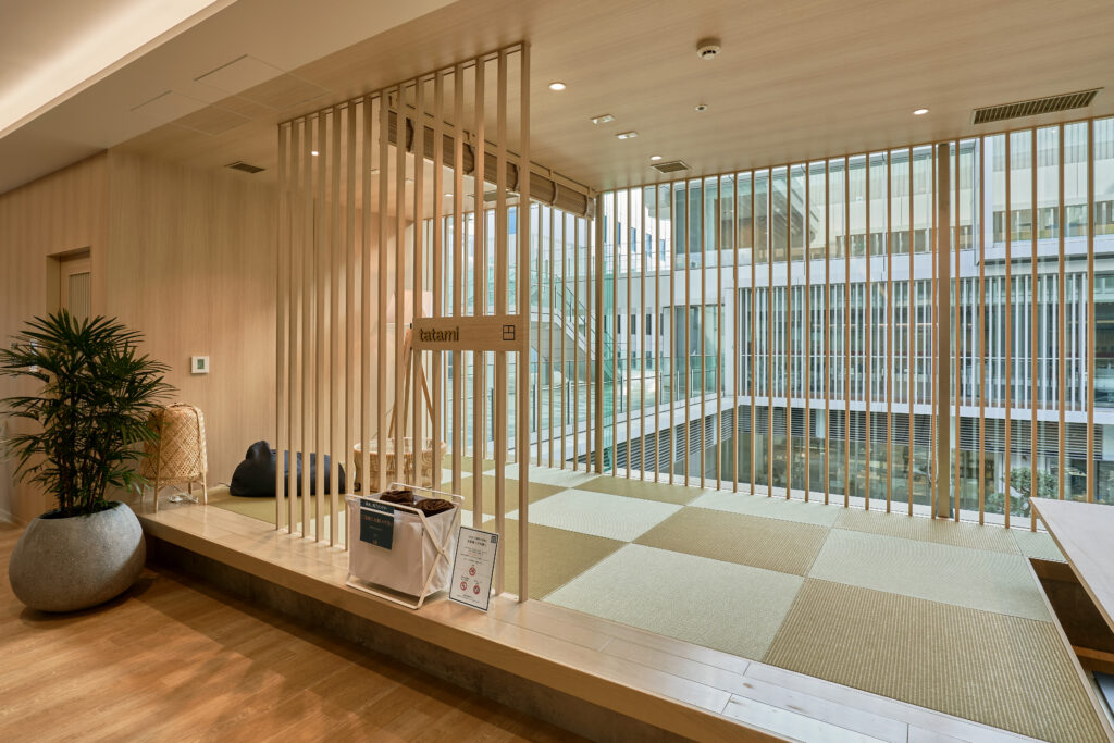 館内にはカフェ型のコワーキングスペースや、企業別の個別ワークスペースなど、幅広い種類のワークスペースが設置されています。どの空間にも一貫しているのが、交流促進を目指した工夫です。