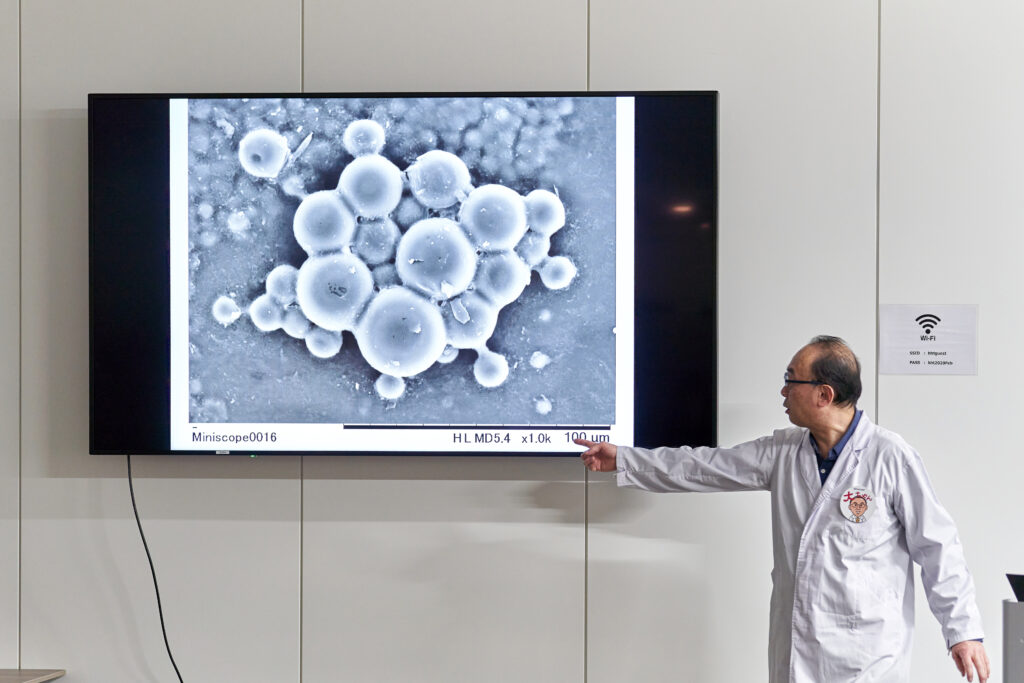 「実はね……」と大ちゃん先生が見せてくれたのは、ハスの葉の表面を電子顕微鏡で拡大した図。これとヨーグルトのフタの構造が似ているというのです。