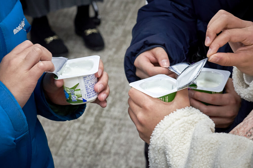 さらにワークショップではヨーグルトのフタに注目。近年メジャーになりつつある、ヨーグルトが付きづらいフタの謎に迫りました。普通のヨーグルトとフタに工夫が施されたヨーグルトの2種類を子どもたちがシェイク! その後、そろりとフタを開けてみます。