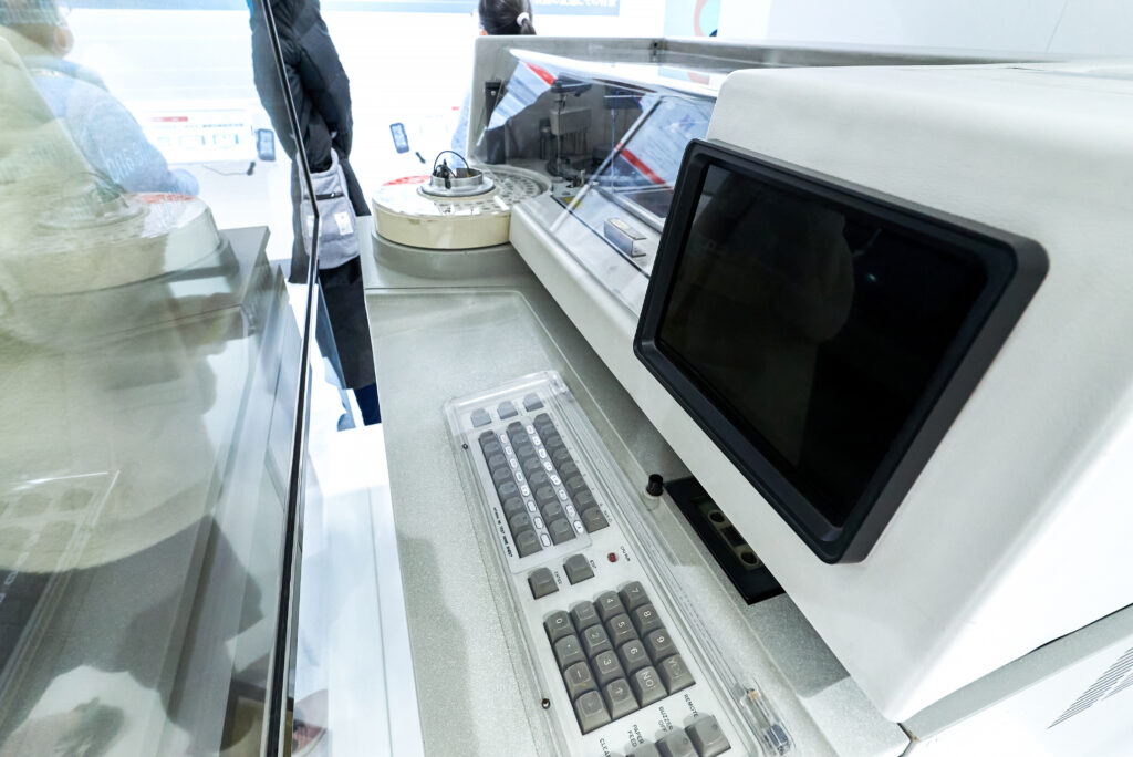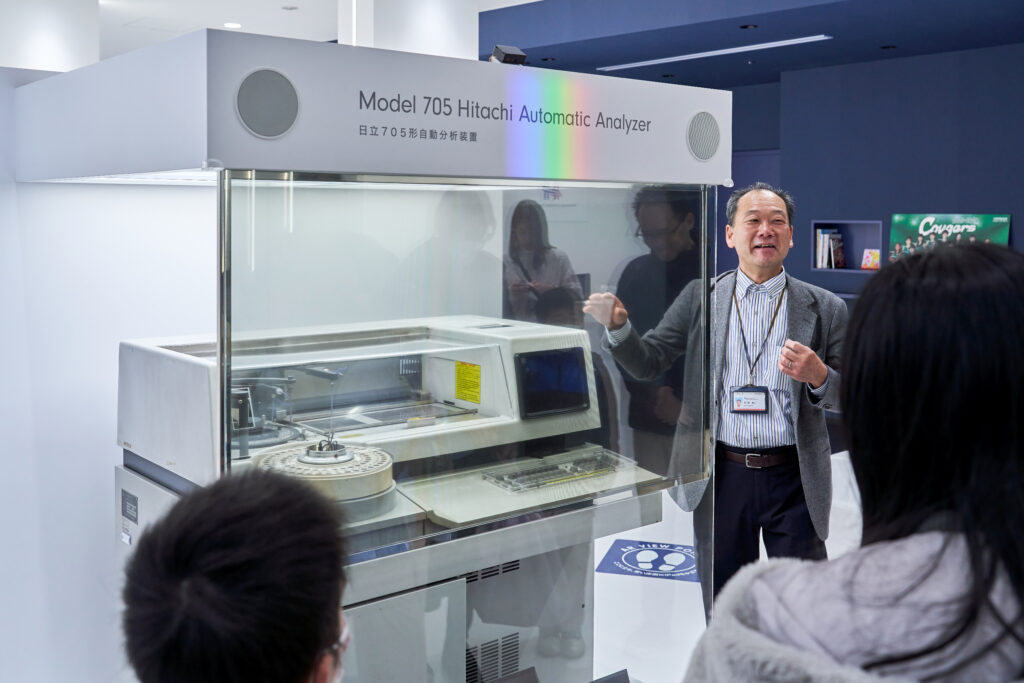 展示スペースの中央にあるのは、日立ハイテクが開発した「日立705形自動分析装置」。医療分野での発展に大きく貢献し、2018年には国立科学博物館重要科学技術史資料(通称:未来技術遺産)にも登録されました。非常にレアな展示に、ワークショップ参加者も興味津々です。これまでの歩みや、未来への展望が展示されており、打ち合わせや商談もできる多目的な空間となっています。