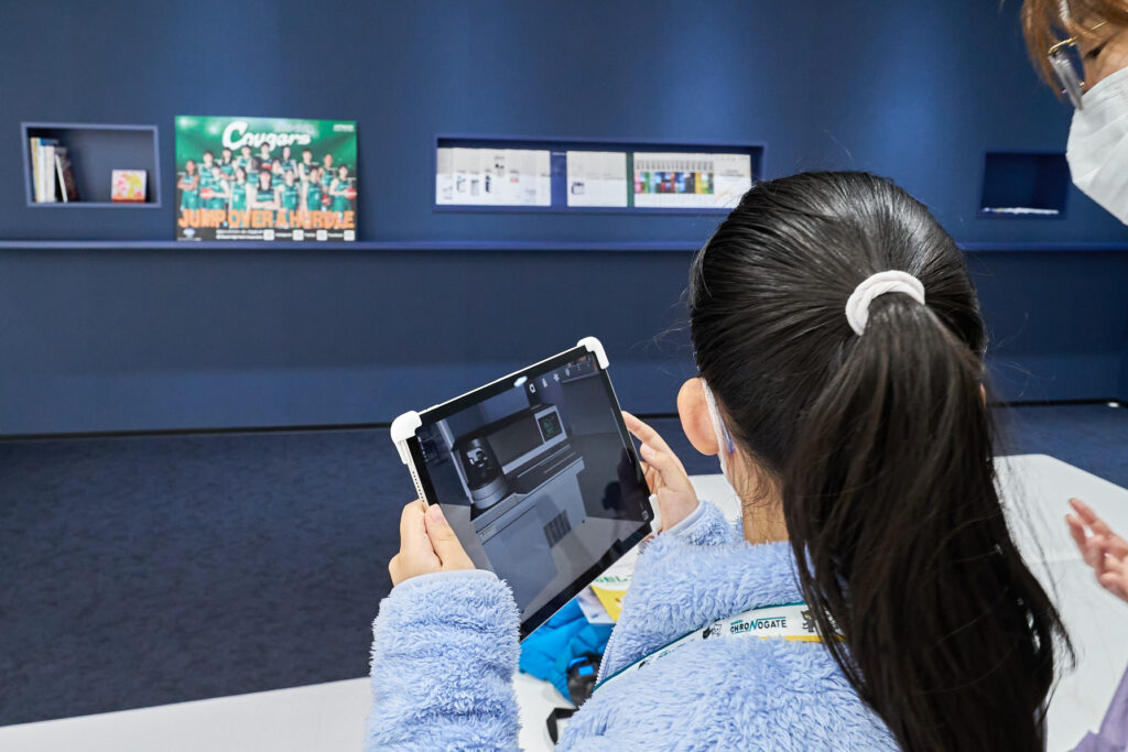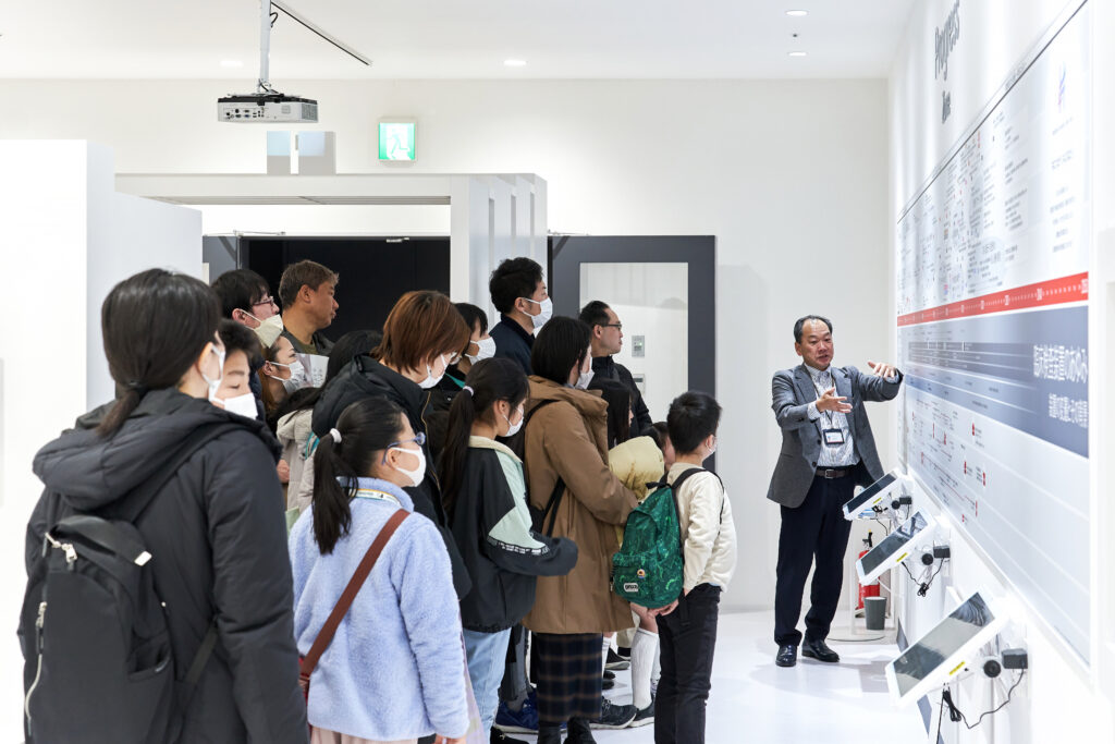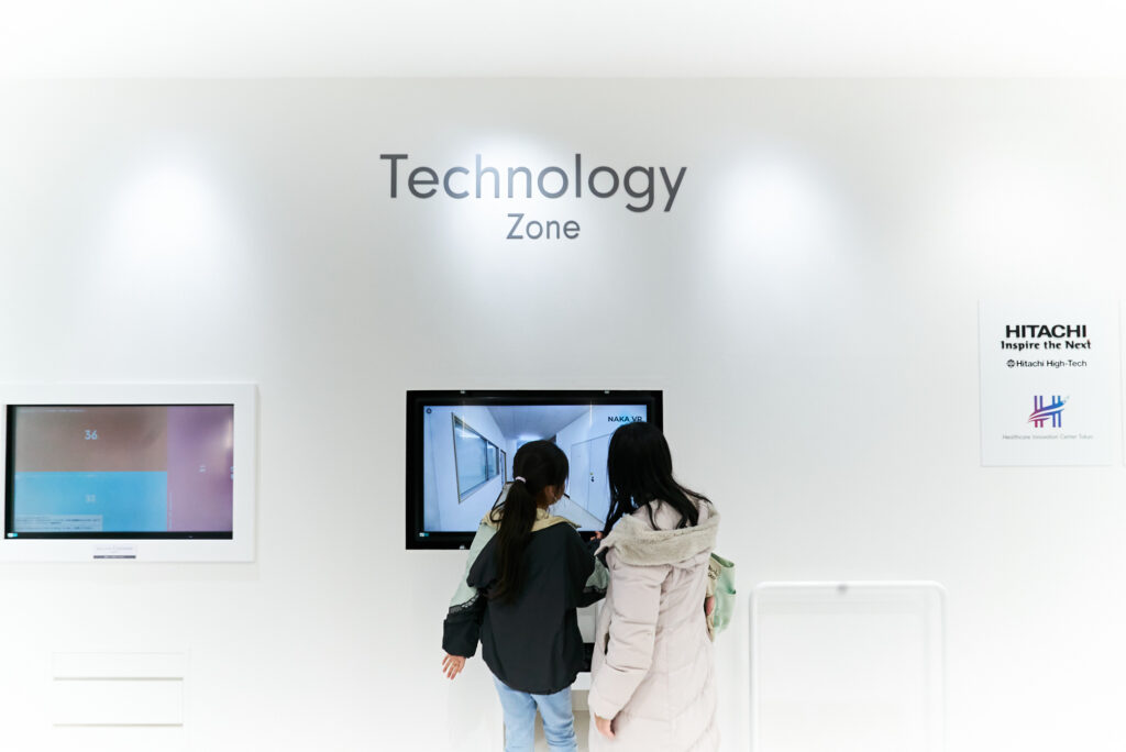 ワークショップを終えた参加者たちは、次に羽田イノベーションシティ内にある日立ハイテクの展示スペースへ。日立ハイテクはヘルスケア事業の拡大を目指して、2022年10月より羽田イノベーションシティに新拠点を展開しています。このスペースには日立ハイテクのワークショップを終えた参加者たちは、次にHICity内にある日立ハイテクの展示スペースへ。日立ハイテクはヘルスケア事業の拡大を目指して、2022年10月よりこの地に新拠点「ヘルスケアイノベーションセンター東京」を展開しています。このスペースには日立ハイテクのこれまでの歩みや、未来への展望が展示されており、打ち合わせや商談もできる多目的な空間となっています。
