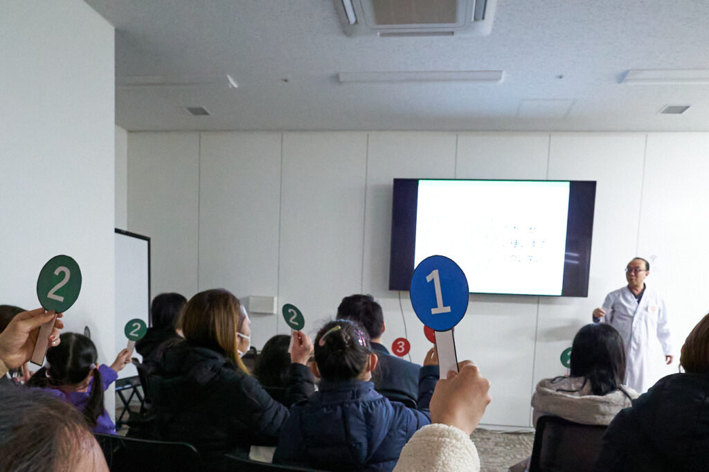 まずは身近なものをテーマにクイズ。最初に登場したのは、いちごの表面を拡大した画像でした。「さて、これは何か分かるかな?」と大ちゃん先生。子どもたちも「もしかして……!」や「いや、違うかも」と首を傾げます。クイズは難易度を上げていき、最終的には猫の毛を拡大した図へ。保護者も頭を悩ますほどの難問となりました。