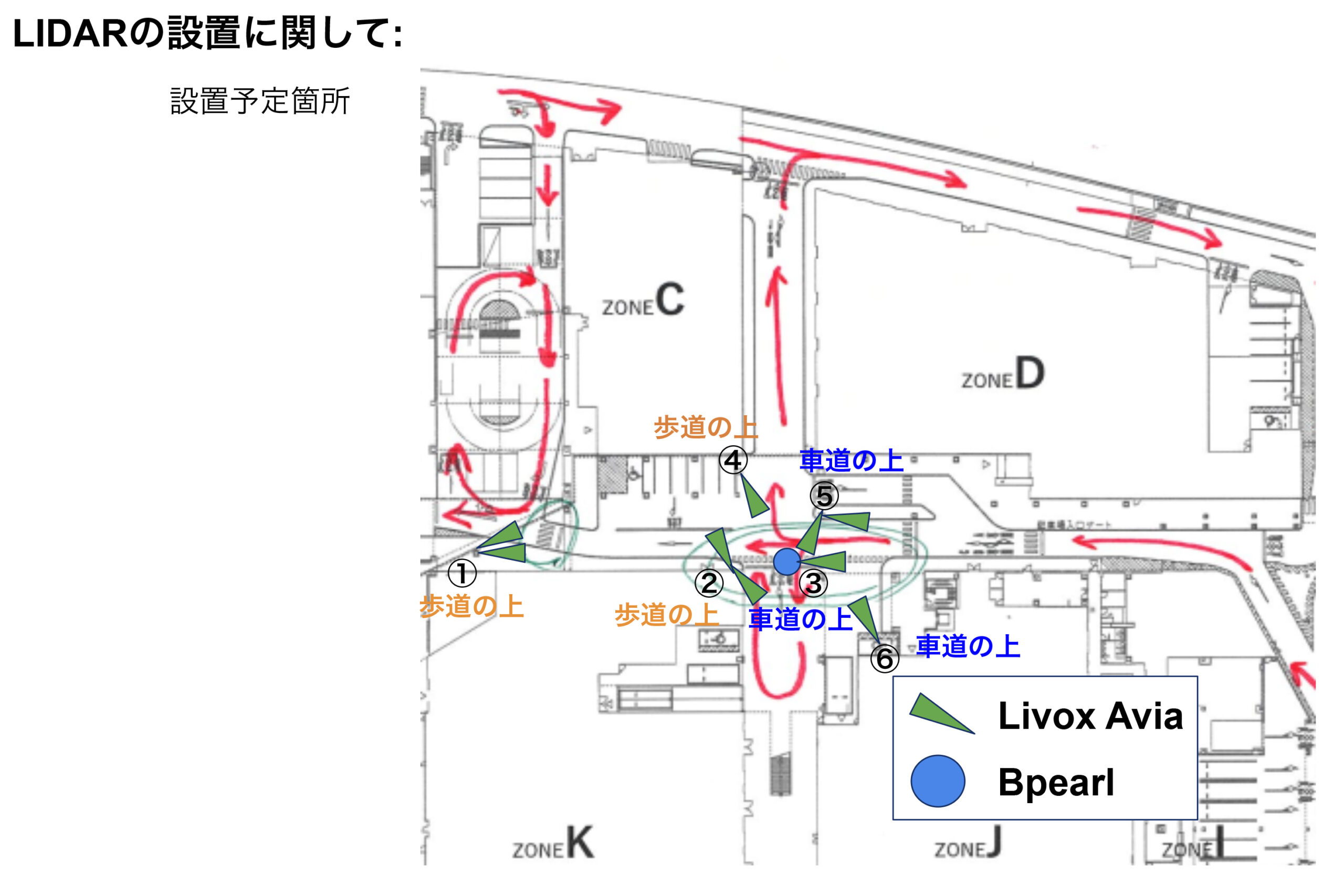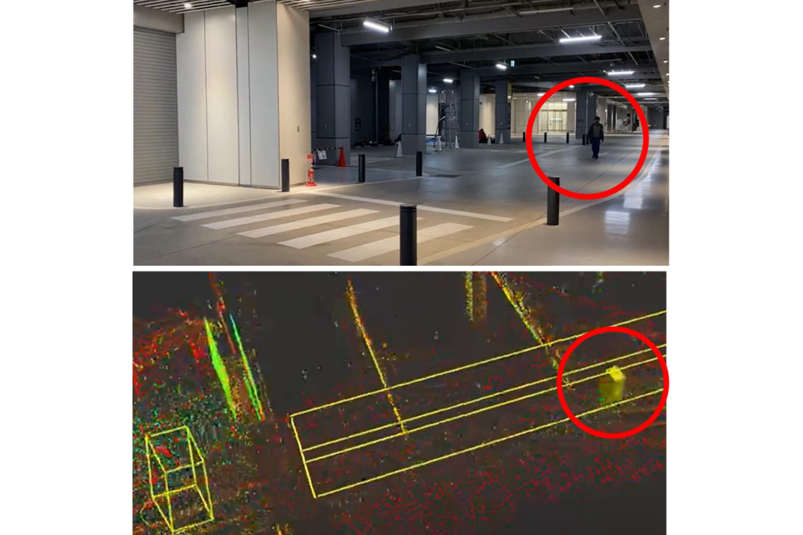 - HICity1階建物側に合計6箇所にLiDARセンサを設置し、LiDARセンサが侵入物を検知した場合に周辺のロボット、モビリティへ検出結果を通知するシステムを開発しました。同情報を1階車路を通る歩行者が判断できるようにするため、侵入物を検知すると点灯し、離脱すると消灯する可視化パトランプを用意しました。