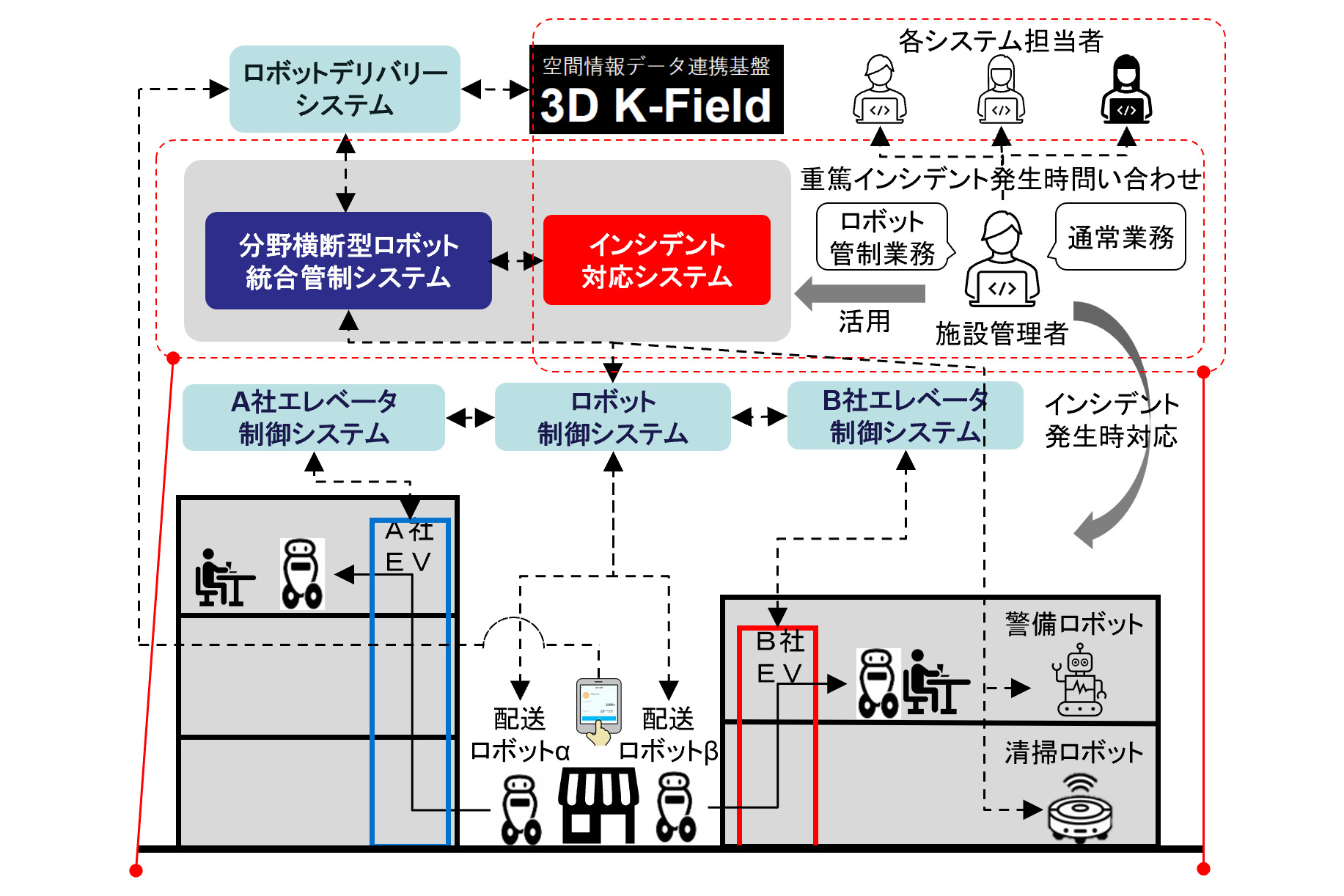 分野横断型のロボット統合管制システムによる複数台・複数種類ロボットのエレベータ連携を含む制御及びインシデント管理