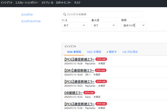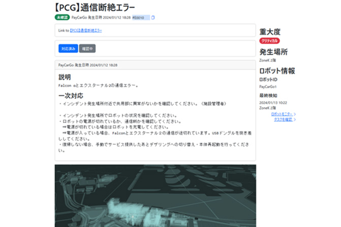 - 課題:ロボットのインシデントは複数の要因を含んでおり、ロボットメーカ、設備管理者、ロボット運用者、など複数の運用主体が見て状況を確認します。各運用主体がどういった対応を行ったかという状況管理を残す機能や、システム的に復帰したかどうかを検知し知らせる可視化機能が必要とされています。